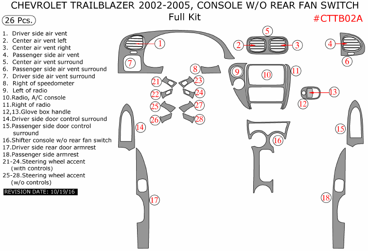 Chevrolet TrailBlazer 2002, 2003, 2004, 2005, Console W/o Rear Fan Switch, Full Interior Kit, 26 Pcs.
