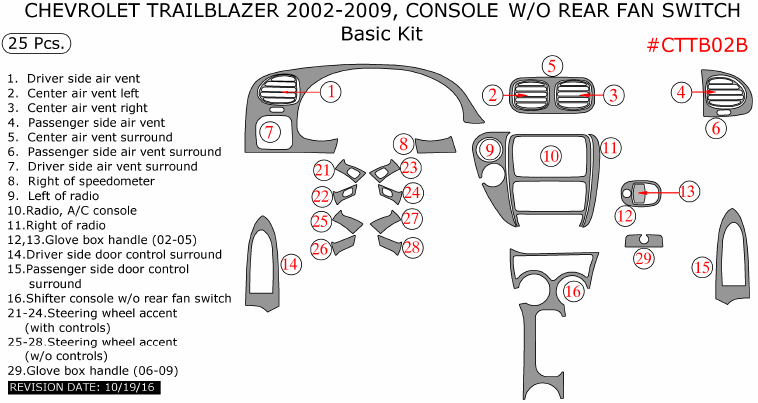 We offer a wide variety of colors and materials of Chevrolet TrailBlazer 2002, 2003, 2004, 2005, 2006, 2007, 2008, 2009, Console W/o Rear Fan Switch, Basic Interior Kit, 25 Pcs. Choose your favourite option and place an order.