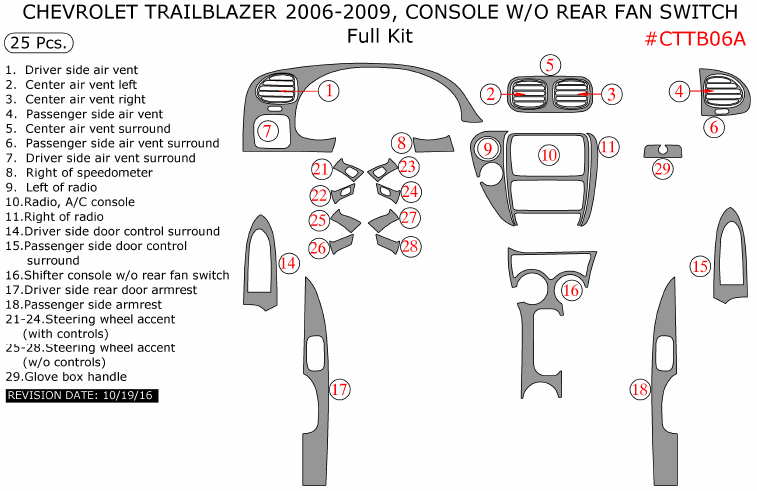 Chevrolet TrailBlazer 2006, 2007, 2008, 2009, Console W/o Rear Fan Switch, Full Interior Kit, 25 Pcs.
