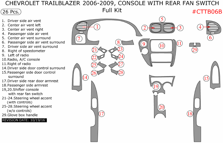 We offer a wide variety of colors and materials of Chevrolet TrailBlazer 2006, 2007, 2008, 2009, Console With Rear Fan Switch, Full Interior Kit, 26 Pcs. Choose your favourite option and place an order.