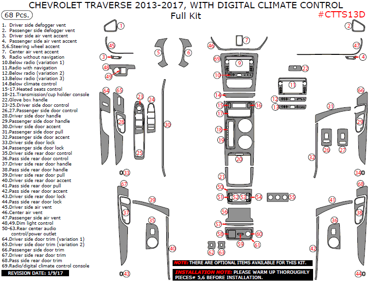 Chevrolet Traverse 2013, 2014, 2015, 2016, 2017, With Digital Climate Control, Full Interior Kit, 68 Pcs.