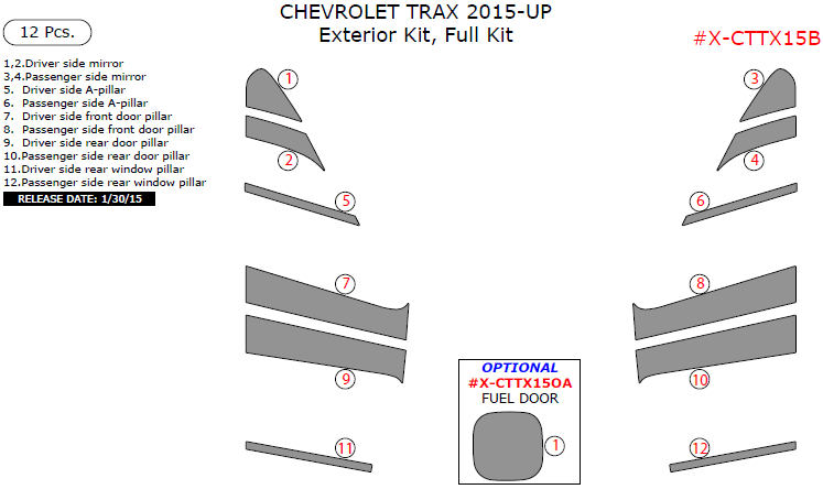 Chevrolet Trax 2015-2016, Exterior Kit, Full Interior Kit, 12 Pcs.