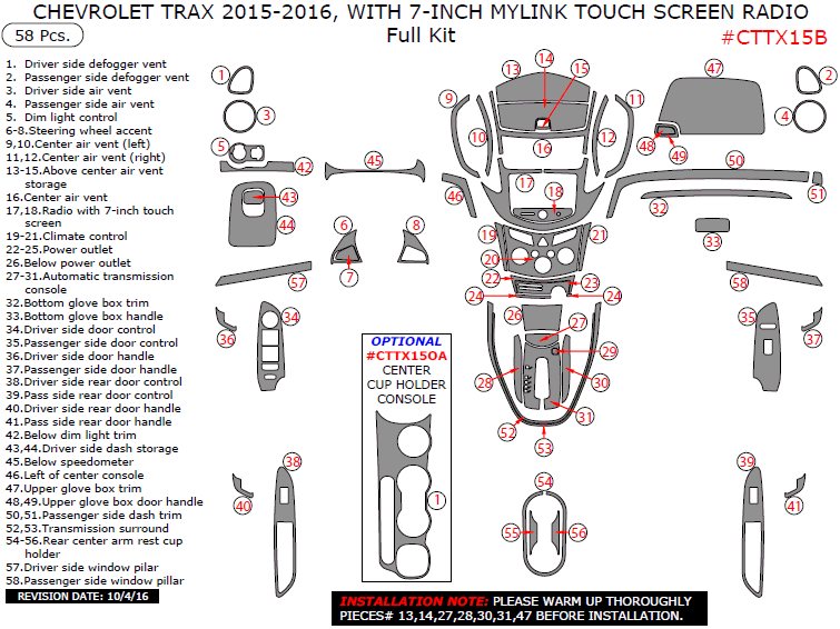 Chevrolet Trax 2015-2016, With 7-Inch MyLink Touch Screen Radio, Full Interior Kit, 58 Pcs.
