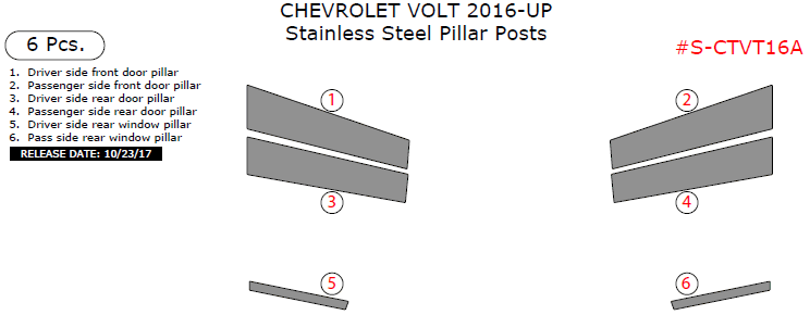 We offer a wide variety of colors and materials of Chevrolet Volt 2016, 2017, 2018, 2019 Stainless Steel Pillar Posts, 6 Pcs. Choose your favourite option and place an order.