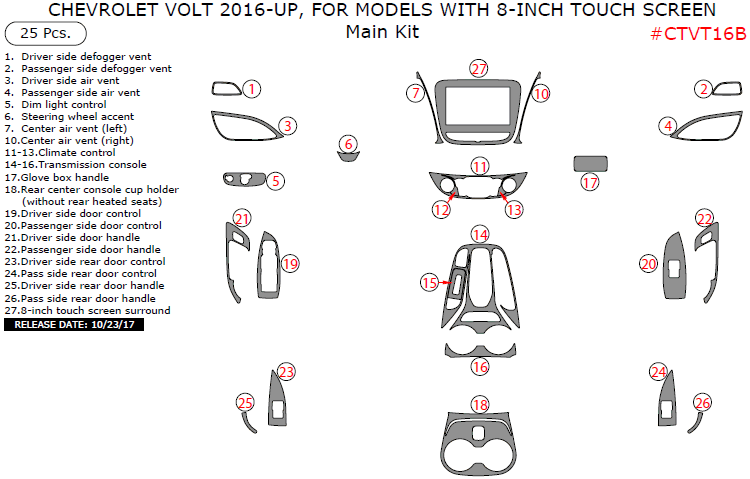 Chevrolet Volt 2016, 2017, 2018, For Models With 8-Inch Touch Screen, Main Interior Kit, 25 Pcs.