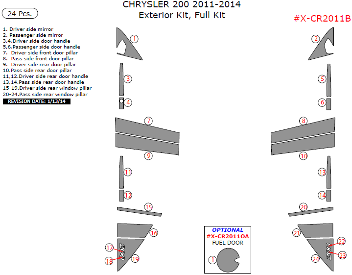 We offer a wide variety of colors and materials of Chrysler 200 2011, 2012, 2013, 2014, Exterior Kit, Full Kit (Sedan Only), 24 Pcs. Choose your favourite option and place an order.