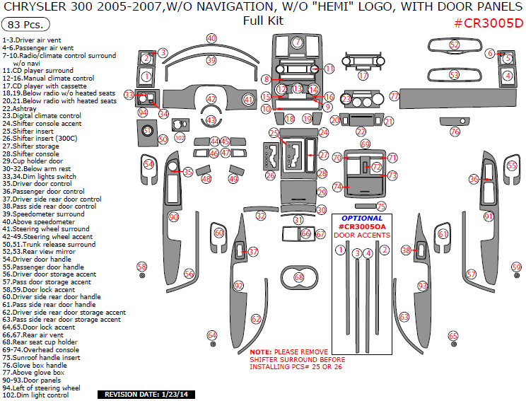 Chrysler 300 2005, 2006, 2007, W/o Navigation, Full Interior Kit, W/o "HEMI" Logo, With Door Panels, 83 Pcs.