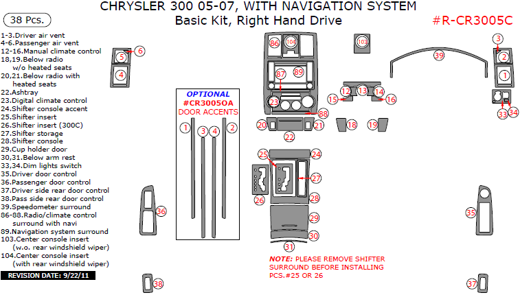 Chrysler 300 2005, 2006, 2007, Right Hand Drive, With Navigation System, Basic Interior Kit, 38 Pcs.