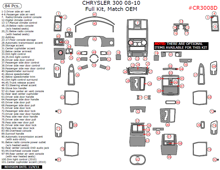 We offer a wide variety of colors and materials of Chrysler 300 2008, 2009, 2010, Full Interior Kit, 84 Pcs., Match OEM. Choose your favourite option and place an order.