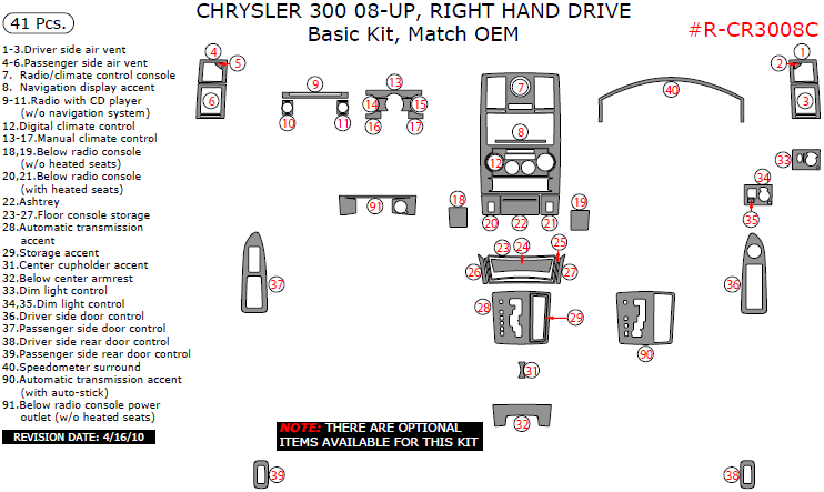 We offer a wide variety of colors and materials of Chrysler 300 2008, 2009, 2010, Right Hand Drive, Basic Interior Kit, 41 Pcs., Match OEM. Choose your favourite option and place an order.