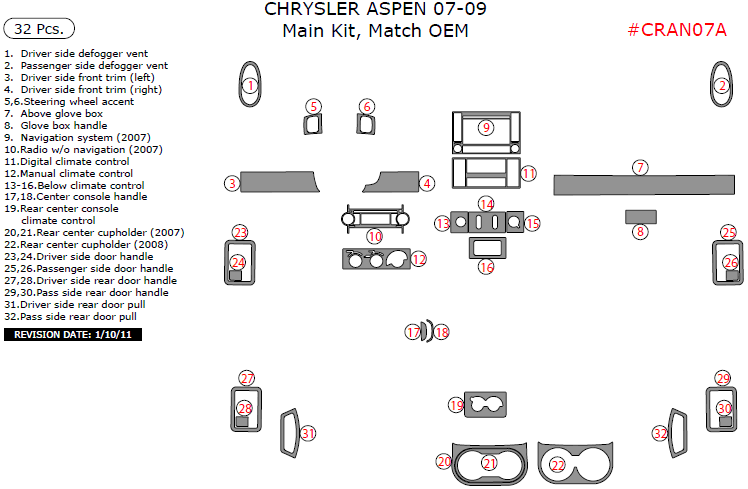 We offer a wide variety of colors and materials of Chrysler Aspen 2007, 2008, 2009, Main Interior Kit, 32 Pcs., Match OEM. Choose your favourite option and place an order.