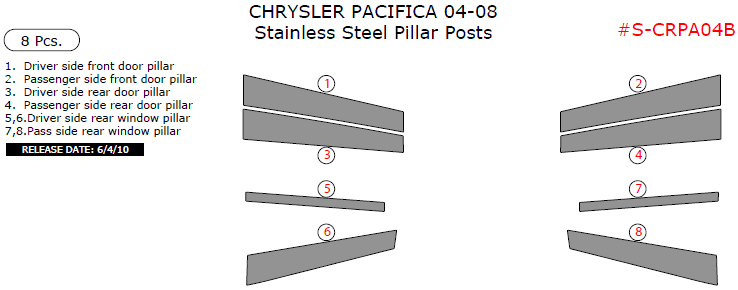 We offer a wide variety of colors and materials of Chrysler Pacifica 2004, 2005, 2006, 2007, 2008, Stainless Steel Pillar Posts, 8 Pcs. Choose your favourite option and place an order.