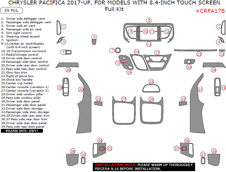 Chrysler Pacifica 2017-2018, For Models With 8.4-Inch Touch Screen, Full Interior Kit, 39 Pcs.