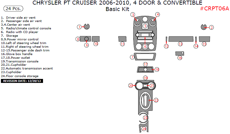 We offer basic interior dash kit of 24 pieces in a wide variety of colors (black, red, white, etc.) and materials (carbon fiber, wood, etc.) for Chrysler PT Cruiser 2006, 2007, 2008, 2009, 2010, 4 door and convertible. Choose your favourite option of this 2006-2010 Chrysler PT interior accessories and place an order to buy the high quality interior trim parts.