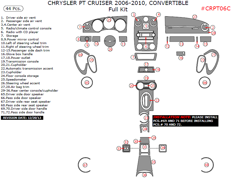 We offer a wide variety of colors and materials of Chrysler PT Cruiser 2006, 2007, 2008, 2009, 2010, Convertible, Full Interior Kit, 44 Pcs. Choose your favourite option and place an order.