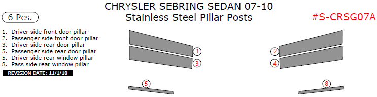 Chrysler Sebring Sedan 2007, 2008, 2009, 2010, Stainless Steel Pillar Posts, 6 Pcs.