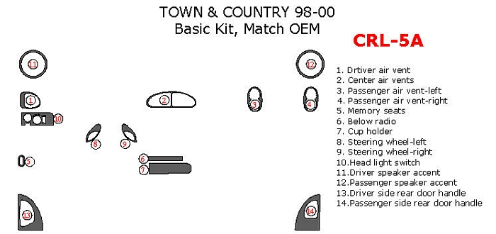 Chrysler Town & Country 1998, 1999, 2000, Basic Interior Kit, 14 Pcs., Match OEM