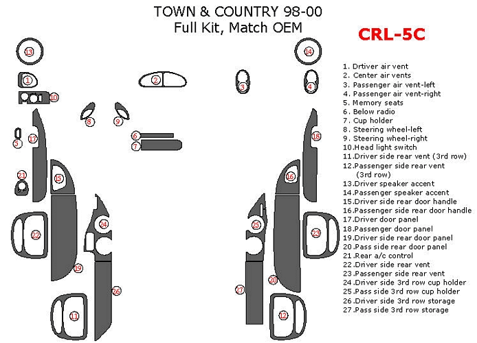 We offer a wide variety of colors and materials of Chrysler Town & Country 1998, 1999, 2000, Full Interior Kit, 27 Pcs., Match OEM. Choose your favourite option and place an order.