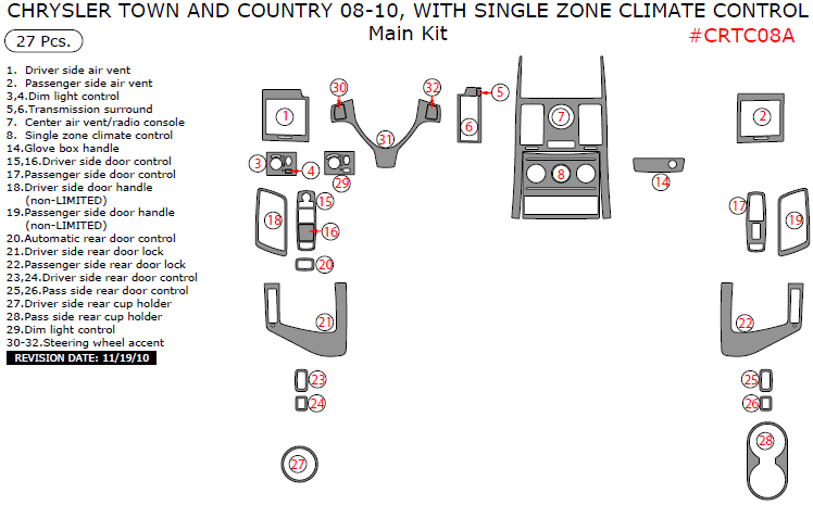 We offer a wide variety of colors and materials of Chrysler Town & Country 2008, 2009, 2010, With Single Zone Climate Control, Main Interior Kit, 27 Pcs., Match OEM. Choose your favourite option and place an order.