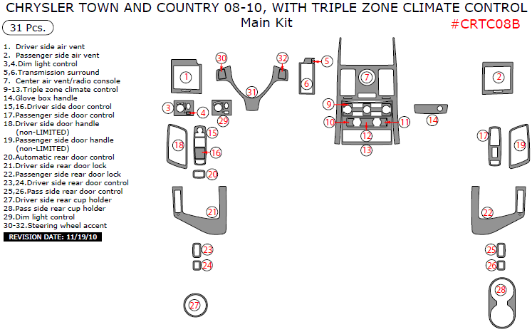 Chrysler Town & Country 2008, 2009, 2010, With Triple Zone Climate Control, Main Interior Kit, 31 Pcs., Match OEM