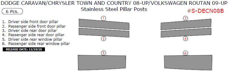Dodge Caravan/Chrysler Town & Country 2008, 2009, 2010, 2011, 2012, 2013, 2014, 2015/Volkswagen Routan 2009-up, Stainless Steel Pillar Posts, 6 Pcs.