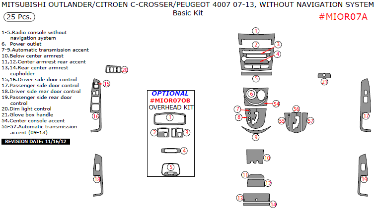 We offer a wide variety of colors and materials of Citroen C-Crosser / Mitsubishi Outlander / Peugeot 4007 2007, 2008, 2009, 2010, 2011, 2012, 2013, W/o Navigation System, Basic Interior Kit, 25 Pcs. Choose your favourite option and place an order.