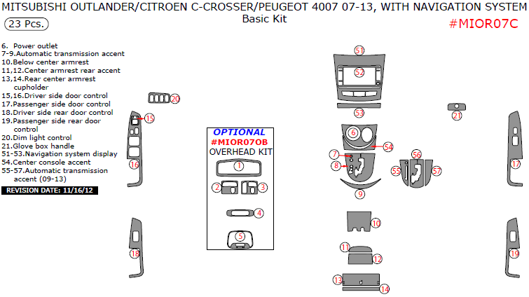 Citroen C-Crosser / Mitsubishi Outlander / Peugeot 4007 2007, 2008, 2009, 2010, 2011, 2012, 2013, With Navigation System, Basic Interior Kit, 23 Pcs.