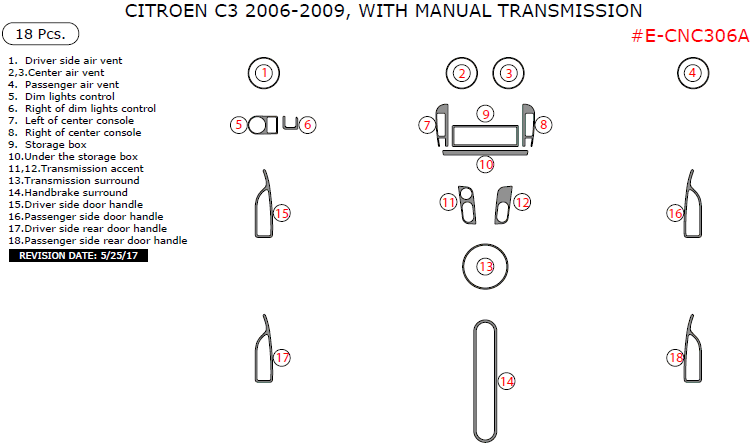 We offer a wide variety of colors and materials of Citroen C3 2006, 2007, 2008, 2009, Interior Kit, With Manual Transmission, 18 Pcs. Choose your favourite option and place an order.
