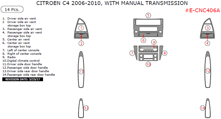 We offer a wide variety of colors and materials of Citroen C4 2006, 2007, 2008, 2009, 2010, Interior Kit, With Manual Transmission, 14 Pcs. Choose your favourite option and place an order.