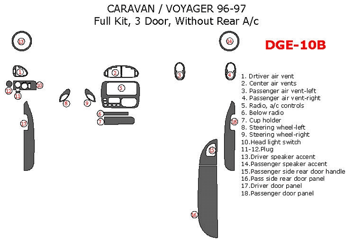 Dodge Caravan 1996-1997, Plymouth Voyager 1996-1997, Full Interior Kit, Without Rear A/c, 3 Door, 18 Pcs.