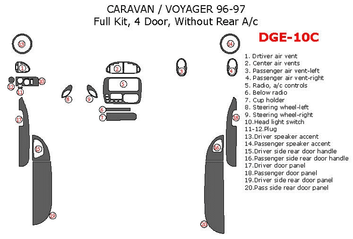 Dodge Caravan 1996-1997, Plymouth Voyager 1996-1997, Full Interior Kit, Without Rear A/c, 4 Door, 20 Pcs.