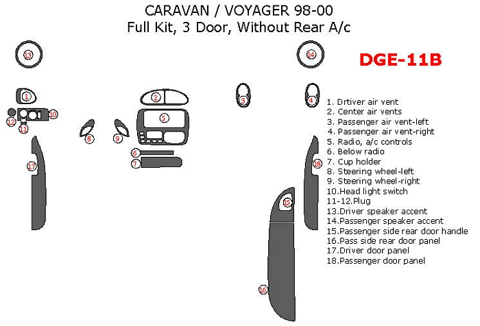 Dodge Caravan 1998, 1999, 2000, Plymouth Voyager 1998-2000, Full Interior Kit, Without Rear A/c, 3 Door, 18 Pcs.
