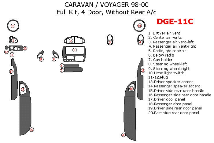 Dodge Caravan 1998, 1999, 2000, Plymouth Voyager 1998-2000, Full Interior Kit, Without Rear A/c, 4 Door, 20 Pcs.