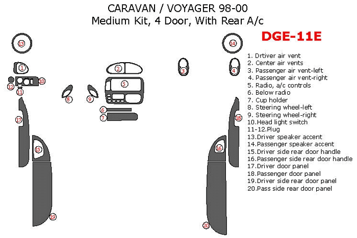 Dodge Caravan 1998, 1999, 2000, Plymouth Voyager 1998-, 2000, Medium Interior Kit, With Rear A/c, 4 Door, 20 Pcs.