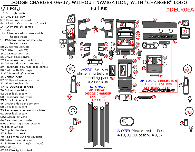 Dodge Charger 2006-2007, W/o Navigation, With "Charger" Logo, Full Interior Kit, 74 Pcs.