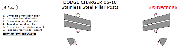 We offer a wide variety of colors and materials of Dodge Charger 2006, 2007, 2008, 2009, 2010, Stainless Steel Pillar Posts, 6 Pcs. Choose your favourite option and place an order.