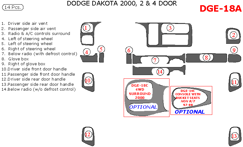 We offer a wide variety of colors and materials of Dodge Dakota 2000, Dodge Dakota 2000, Interior Dash Kit, 2&4 Door, 14 Pcs. Choose your favourite option and place an order.