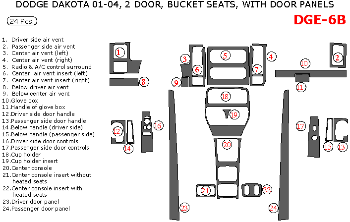 Dodge Dakota 2001, 2002, 2003, 2004, Interior Dash Kit, 2 Door, Bucket Seats, With Door Panels, 24 Pcs.
