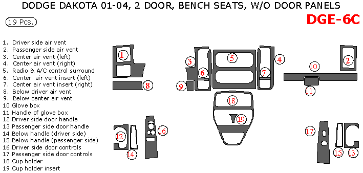 We offer a wide variety of colors and materials of Dodge Dakota 2001, 2002, 2003, 2004, Interior Dash Kit, 2 Door, Bench Seats, Without Door Panels, 19 Pcs. Choose your favourite option and place an order.