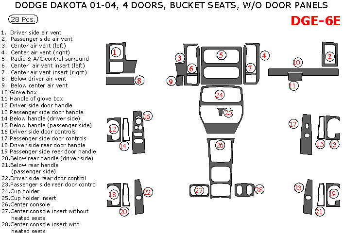 We offer a wide variety of colors and materials of Dodge Dakota 2001, 2002, 2003, 2004, Interior Dash Kit, 4 Door, Bucket Seats, Without Door Panels, 28 Pcs. Choose your favourite option and place an order.