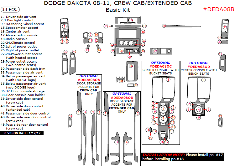 We offer a wide variety of colors and materials of Dodge Dakota 2008, 2009, 2010, 2011, Crew Cab/Extended Cab, Basic Interior Kit, 33 Pcs. Choose your favourite option and place an order.