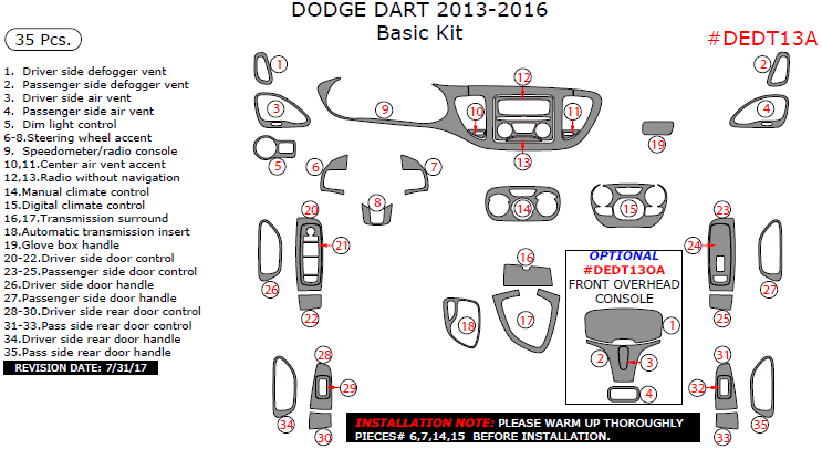 We offer a wide variety of colors and materials of Dodge Dart 2013, 2014, 2015, 2016, Basic Interior Kit, 35 Pcs. Choose your favourite option and place an order.