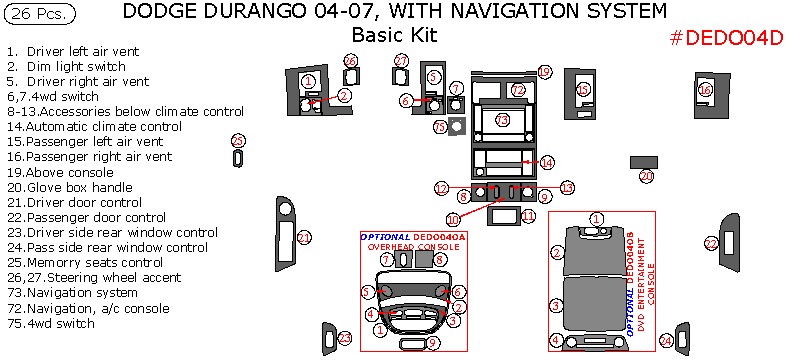 We offer a wide variety of colors and materials of Dodge Durango 2004, 2005, 2006, 2007, With Navigation, Basic Interior Kit, 26 Pcs. Choose your favourite option and place an order.