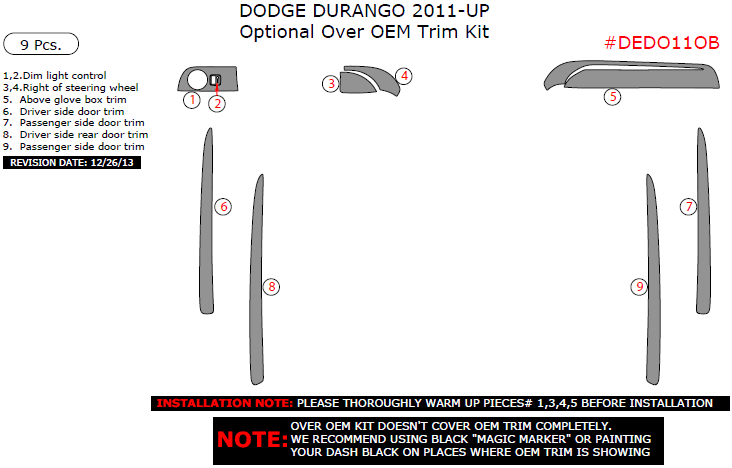 Dodge Durango 2011, 2012, 2013, 2014, 2015, 2016, 2017, 2018, 2019, 2020 Optional Over OEM Interior Trim Kit, 9 Pcs.