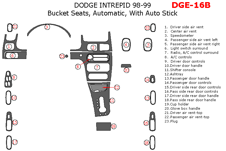 Dodge Intrepid 1998-1999, Interior Dash Kit, Bucket Seats, Automatic, With Auto-stick, 23 Pcs.