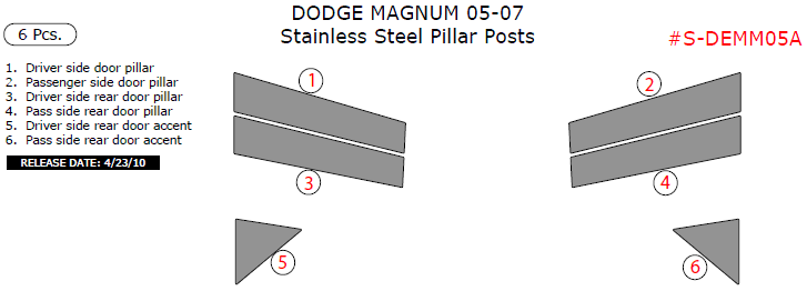 We offer a wide variety of colors and materials of Dodge Magnum 2005, 2006, 2007, Stainless Steel Pillar Posts, 6 Pcs. Choose your favourite option and place an order.