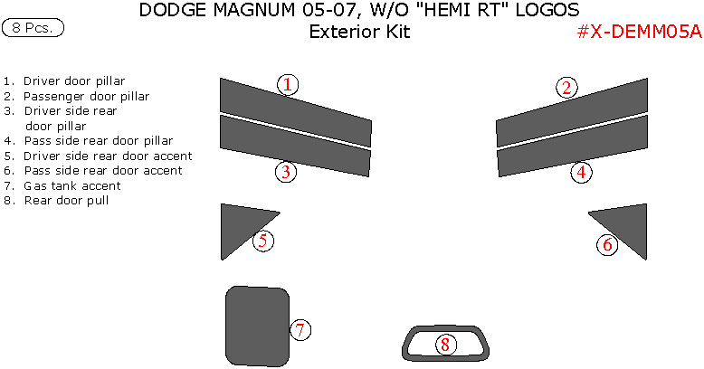 We offer a wide variety of colors and materials of Dodge Magnum 2005, 2006, 2007, Exterior Kit, W/o "HEMI R/T" Logos, 8 Pcs. Choose your favourite option and place an order.