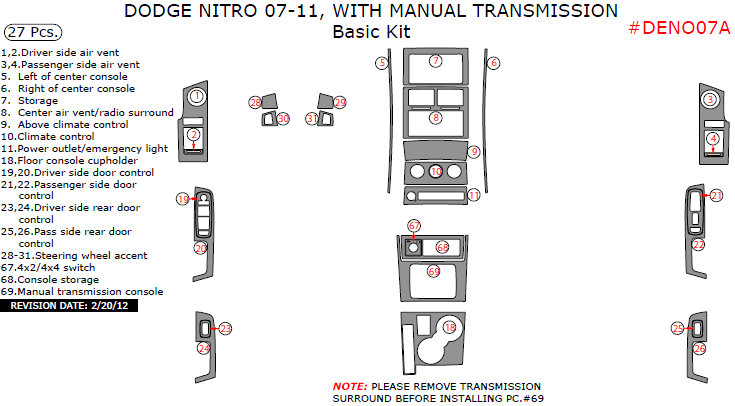 We offer a wide variety of colors and materials of Dodge Nitro 2007, 2008, 2009, 2010, 2011, With Manual Transmission, Basic Interior Kit, 27 Pcs. Choose your favourite option and place an order.