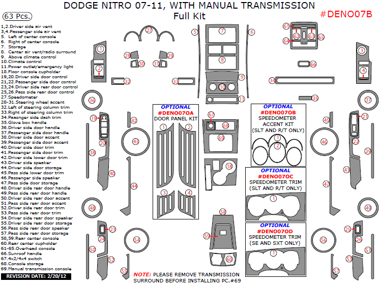 We offer a wide variety of colors and materials of Dodge Nitro 2007, 2008, 2009, 2010, 2011, With Manual Transmission, Full Interior Kit, 63 Pcs. Choose your favourite option and place an order.