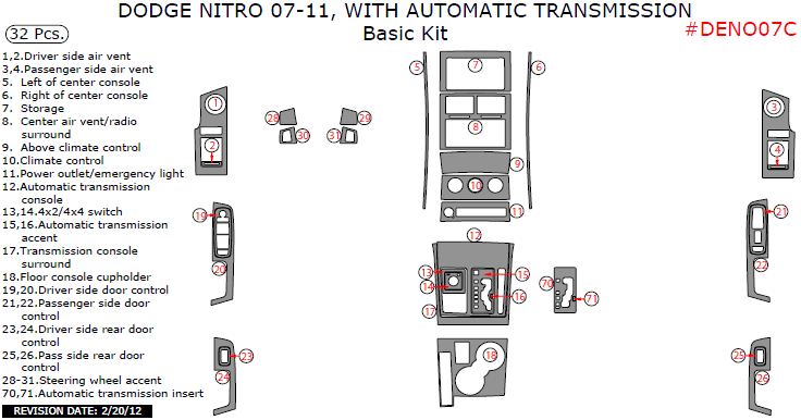 We offer a wide variety of colors and materials of Dodge Nitro 2007, 2008, 2009, 2010, 2011, With Automatic Transmission, Basic Interior Kit, 32 Pcs. Choose your favourite option and place an order.